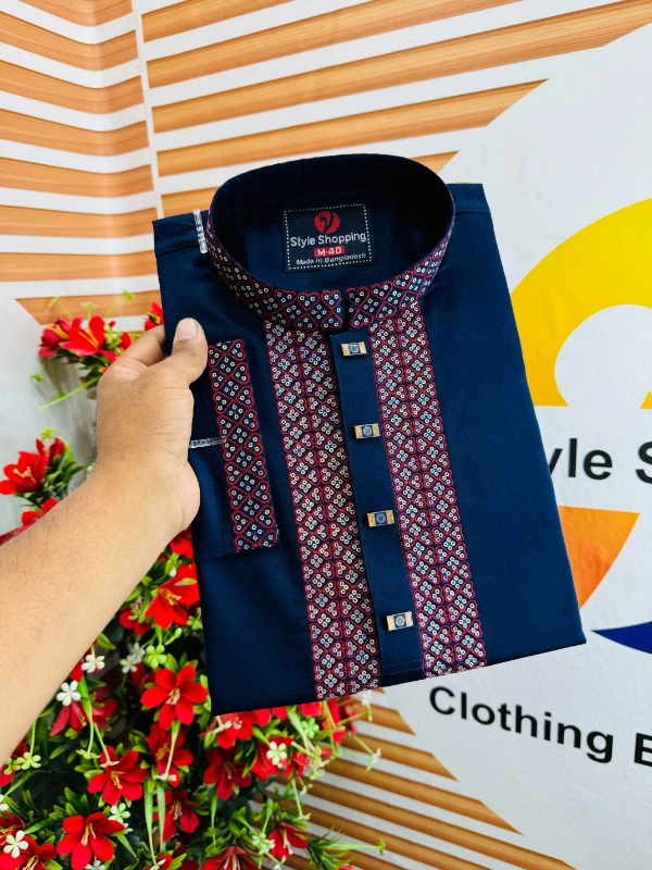 সাটন স্লাব কটন পাঞ্জাবি বুকে হাতায় এমব্রয়ডারি সিকুয়েন্সের কাজ করা প্রিমিয়াম কোয়ালিটি স্নাপ বাটন সাইজ